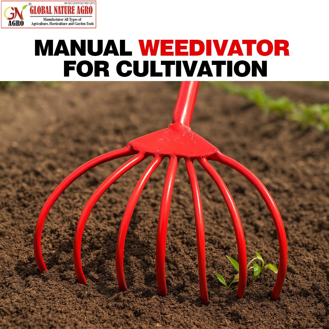 The Global Nature Agro 5-Tine Hand Cultivator with Stirrup Weed Remover is a powerful manual gardening tool designed to make soil cultivation and weed removal faster, easier, and more effective. This dual-function tool features strong curved tines that loosen compact soil, improve aeration, and prepare beds for planting. The attached sharp stirrup blade slides just below the soil surface to cut weeds from the roots without disturbing nearby plants. Manufactured using heavy-duty hardened steel, this tool offers excellent durability and resistance to bending or breaking during regular agricultural use. The ergonomic handle grip ensures better control and comfort, reducing strain on hands and wrists. Ideal for gardeners, farmers, and nursery owners, this tool is suitable for vegetable fields, flower beds, kitchen gardens, and small farms. It is eco-friendly, requires no fuel or electricity, and delivers reliable performance season after season. Grow healthier soil and weed-free fields with Global Nature Agro – trusted by farmers and gardeners across India.
